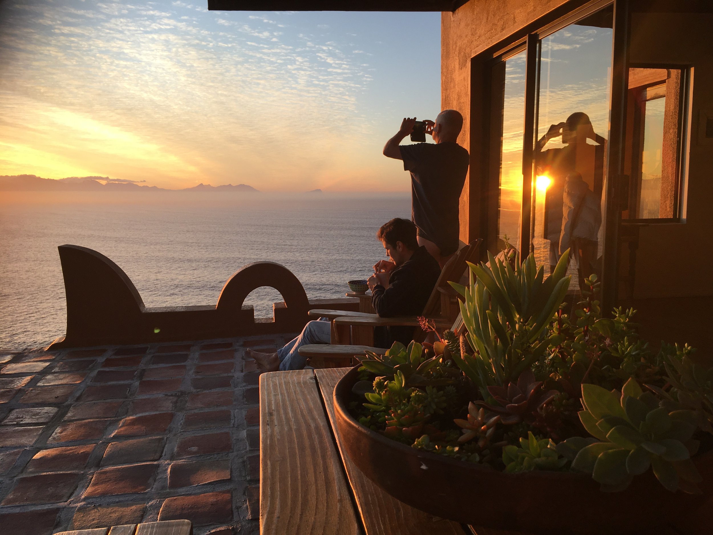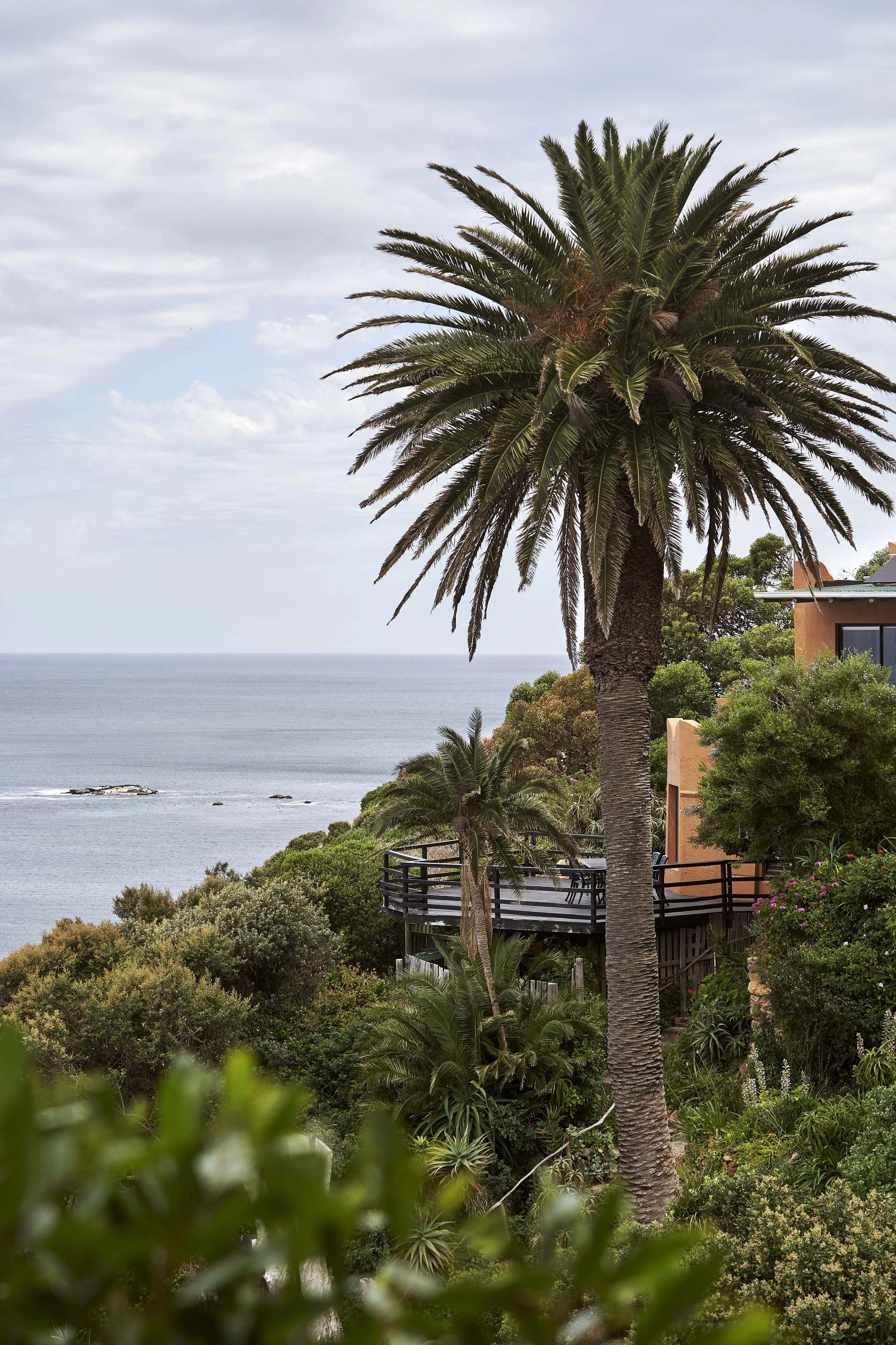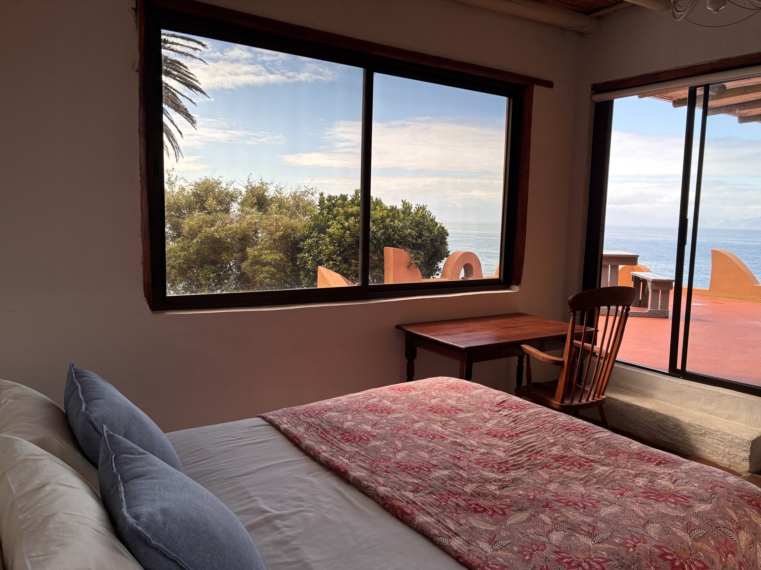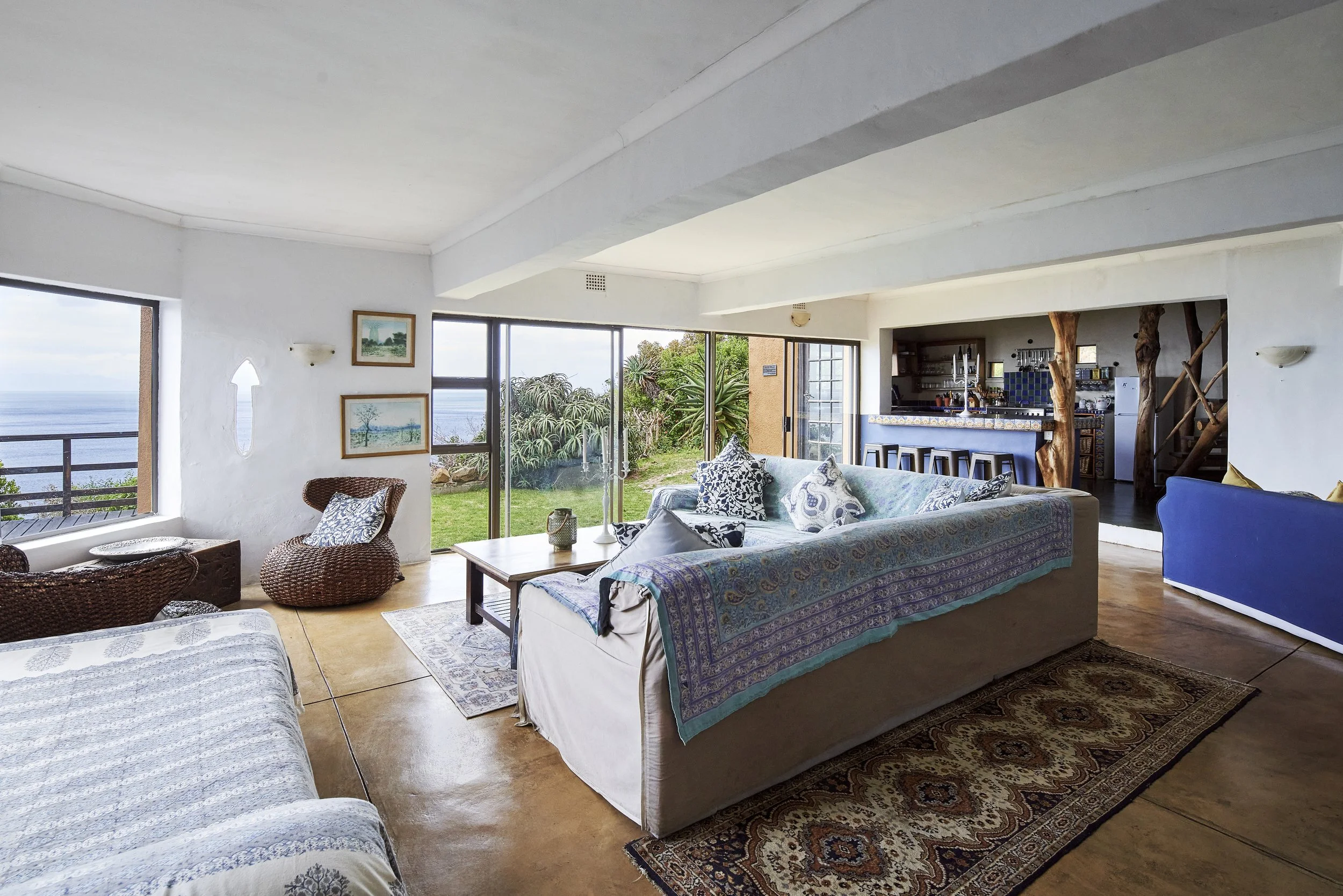 The living area has comfortable couches and a wood fire large enough to cook in. It leads onto a charming garden and sprawling deck that overlook the sea